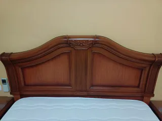Dormitorio de matrimonio, ideal para amueblar tu habitación. -Conjunto de dormitorio de matrimonio color cerezo del fabricante puchades. Cabecero curvado y dos mesitas de noche con tres cajones cada una y tapa de cristal. comoda con cinco cajones con tapa de cristal y espejo
