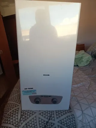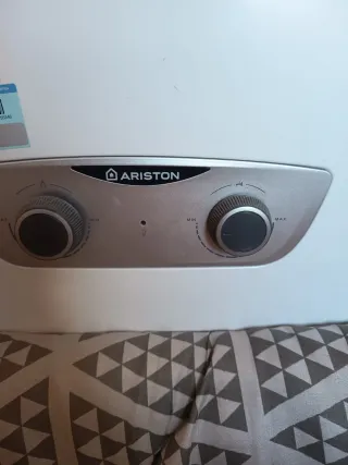 Calentador de gas de la marca Ariston en color blanco. Diseñado para ofrecer un rendimiento eficiente.tiene 2 años y medio casi sin uso esta nuevo - Modelo MY TEAM. - Dos mandos giratorios para ajuste. - Panel frontal con detalles plateados.