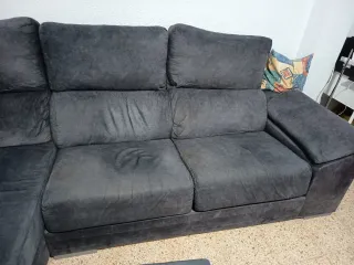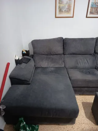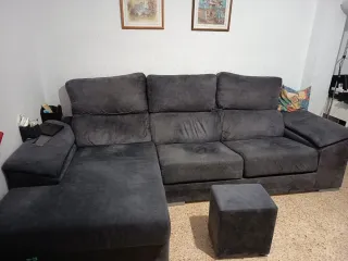 Sofá chaise longue de tela en color gris. Es un mueble cómodo y espacioso para tu salón. - Tapicería de tela. - Diseño moderno. Desenfundable .Tiene un defecto en el lado derecho se unde un poco .Hay una tabla puesta y ya no se hunde Viene con dos puf.Precio negociable