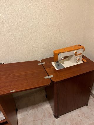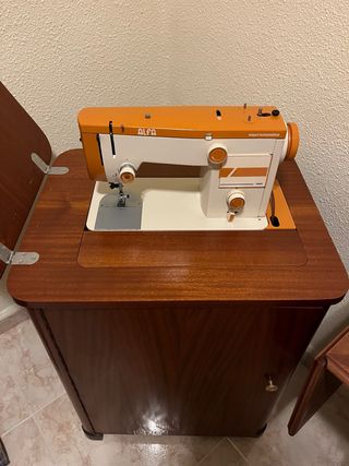 Máquina de coser Alfa Superautomática, modelo 1680. Un clásico para tus proyectos de costura. - Diseño retro en naranja y blanco. - Incluye mueble de madera. - Ideal para trabajos de costura variados.