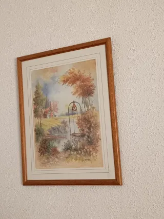 Precioso cuadro decorativo con una escena campestre. - Representa un paisaje con un pozo, una casa y vegetación. - Marco de madera.
