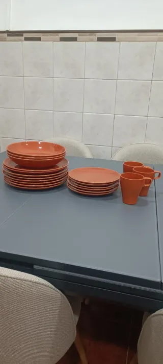 Conjunto de vajilla en color naranja. - Variedad de platos y cuencos: •Platos llanos pequeños 6u ( 21cm) •Platos llanos grandes 8u (27cm) •Platos hondos 3u (24cm) - Tazas a juego incluidas 3u ( 10cm alta x 8 cm diámetro) Adjunto foto que se aprecia que tengo buen embalaje para poder hacer envíos