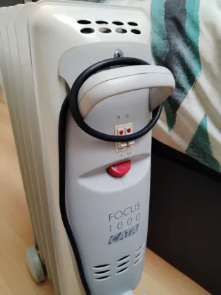 Radiador eléctrico de la marca Cata, modelo Focus 1000. Es un radiador pequeño portátil con ruedas que funciona perfectamente. Siempre muy cuidado y limpio.