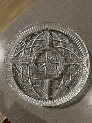 Elegante bandeja de cristal con un diseño grabado. - Diseño con estrellas y rombos. - Borde exterior con detalles. - Centro circular. - 5 compartimentos -Nueva sin estrenar
