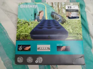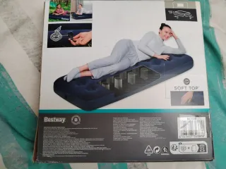 Colchón hinchable de la marca Bestway, ideal para camping o invitados. - Medidas: 1.85m x 76cm x 22cm. - Superficie superior suave al tacto. - Incluye kit de reparación. - Sin usar, sin abrir la caja. Nuevo