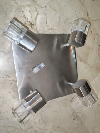 Plafón de techo con cuatro puntos de luz. - Base cuadrada metálica. - Focos con acabado en metal y cristal.