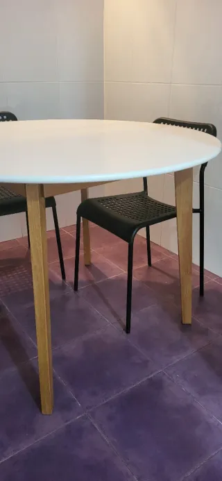 Conjunto de mesa redonda con patas de madera y cuatro sillas negras. - Mesa con superficie blanca. - Patas de mesa de madera. - Sillas con diseño moderno y perforado. Sillas apilables. Precio negociable.