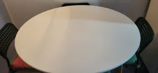 Mesa redonda blanca con 4 sillas negras de plástic