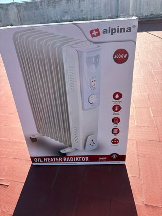 Radiador de aceite marca Alpina con una potencia de 2000W. - 3 niveles de calor ajustables. - Termostato regulable. - Asa de fácil agarre. - Ruedas para facilitar el movimiento. - Protección contra sobrecalentamiento.