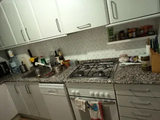 Conjunto de muebles de cocina con acabados modernos. - Encimera de mármol. - Armarios con puertas de madera y tiradores metálicos. - Compartimentos de plástico para organización. Cocina de gas Incluye todos los muebles de cocina .El fregadero con el grifo .La encimera es de mármol No incluye la cocina de gas .El horno eléctrico y lavavajillas .Eso es aparte .Se puede negociar .Si interesa todo