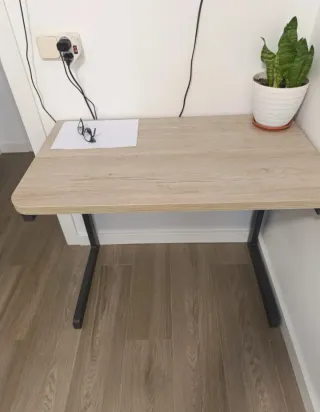 Mesa de estudio con un diseño moderno y funcional. - Tablero de madera con acabado natural. - Estructura de metal resistente.