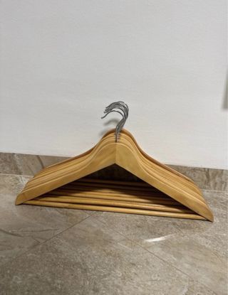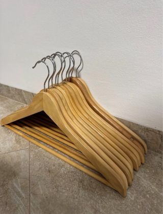 Conjunto de diez perchas de madera con acabado natural y ganchos plateados. - Diseño clásico y funcional. - Ideales para organizar tu armario. En caso de querer mas perchas contactar conmigo y hablamos el precio