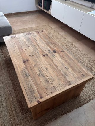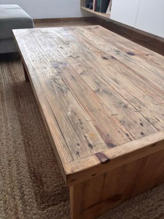 Mesa de centro Alenka de la marca Hannun, con un diseño rústico y natural. - Tablero de madera con acabado envejecido. - Base de yute. - Patas de madera robustas. Precio original 425 euros.