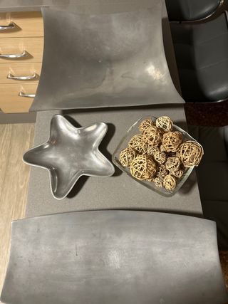 Conjunto de bandejas decorativas con un diseño moderno. - Bandeja principal de metal con forma curva. - Plato decorativo en forma de estrella de metal. - Regalo las bolas de Ratán con las 3 -Unidad -Cuadrada 10€ -Rectangular 8€ -Estrella 5€ El lote de las 3 se queda en 20€