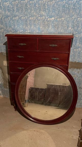 Conjunto de muebles de madera con espejo Madera maciza Ideal para restauradores y decoradores, para hacer tus propios diseños También se venden las piezas sueltas. Medidas en las fotos - Cómoda de gran capacidad. - Dos mesitas de noche a juego. - Espejo ovalado con marco de madera. - Las patas tienen algo de carcoma