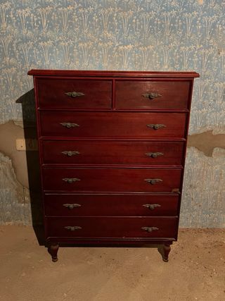 Conjunto de cómoda alta tipo sinfonier y espejo. Tengo la comoda y las mesitas a juego en otro anuncio. - Cómoda de madera con varios cajones. - Espejo con marco de madera.