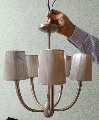 Elegante lámpara colgante con un diseño moderno y clásico a la vez. Es de acero inoxidable y las tulipas de hilos plateados que hace un efecto muy bonito. Diseño de 5 brazos El brazo central es telescópico y se estira 25 cm más