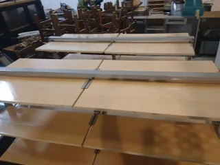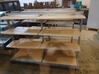 Estanterías modulares con estructura metálica y baldas de madera y ruedas para facil desplazamiento. - Diseño versátil. - Ideal para organizar espacios. - Puedes poner los estantes e la altura que los necesites. Cada una 100€. Las 2 estanterías 150€. Medidas: 1,65x66x1,30 Medidas. 1,75x66x1,30 Son de ocasión.