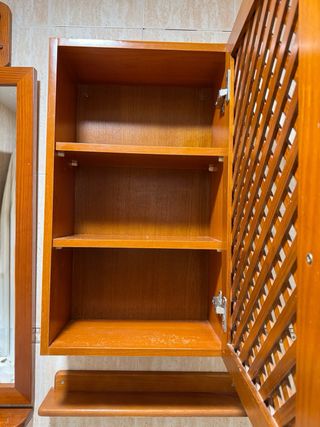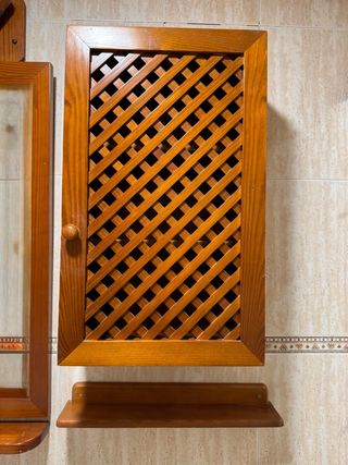 Mueble de baño con un diseño de celosía. - Acabado en madera natural. - Puerta con pomo. - Incluye una balda inferior. - Espejo - Estanterias - Toallero