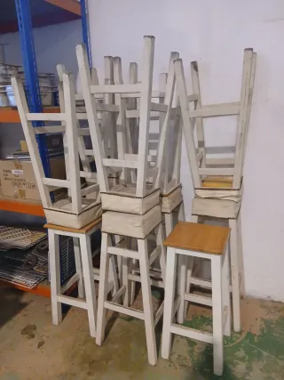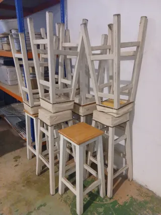 Conjunto de taburetes altos, medidas: 85x25 y 85x30 - Estructura de madera. - Estantes para restaurar, son de ocasión se vende el lote entero (11 unidades) 120€.
