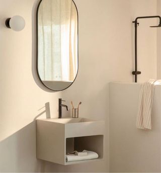 A ESTRENAR Lavabo de diseño moderno con líneas limpias y forma cuadrada. - Acabado en color beige. - Grifería en color negro. Precio original 379€
