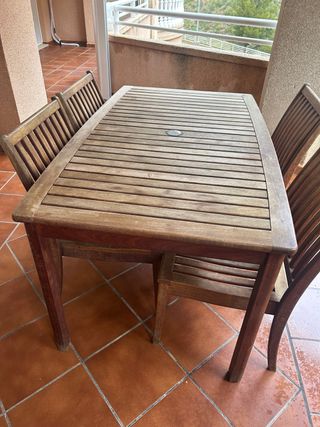 Conjunto de mesa y cuatro sillas de madera, perfecto para exteriores. - Mesa rectangular con diseño de listones. - Sillas con respaldo acanalado. RECOGIDA EN CULLERA