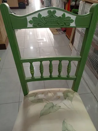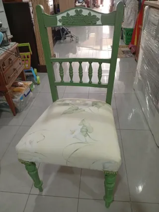 Elegante silla de estilo vintage con un bonito tapizado floral. - Patas y estructura de madera pintadas en verde. - Asiento y respaldo con tela estampada. - Detalles decorativos en la parte superior del respaldo.