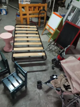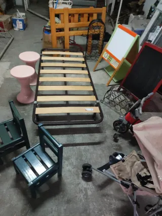 Conjunto variado de artículos para el hogar y uso infantil. - somier de 80 - Dos taburetes plástico - Dos sillas pequeñas madera - Pizarra doble Pizarra de niños - Carrito de bebé - dos botelleros de forja Dos cabezales de 90cm Triciclo