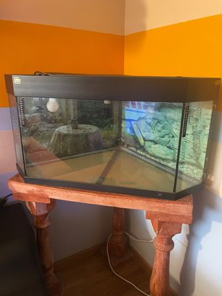Acuario o terrario con una capacidad de 175 litros, forma de quesito para esquinas de 90º com pie de escayola, el que aparece en la foto - Diseño moderno y elegante. - Ideal para crear tu propio ecosistema.