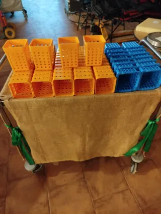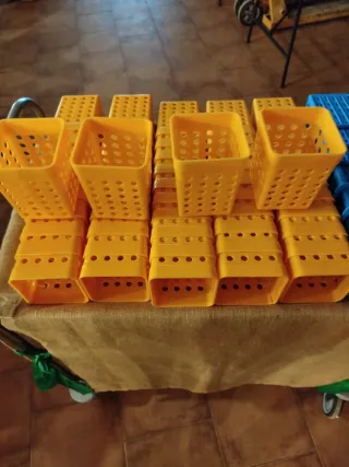 Conjunto de cubiletes para organizar cubiertos. Dispongo de 54 unidades amarillos y 14 unidades azules - Fabricados en plástico resistente. - Color amarillo y azul - Diseño con múltiples perforaciones para ventilación.