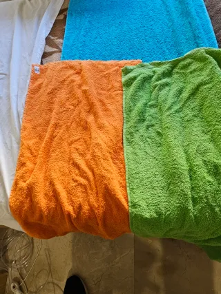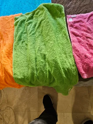 Conjunto de toallas de diferentes tamaños, ideales para el hogar. Son nuevas a estrenar. _Fabricadas en algodón. - Incluye toallas de color azul, verde y naranja. A estrenar. Dste prisa no sea que otro. Se axelante. No te arrepentiras. Gracias. Çhao.