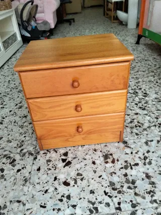 Mesita de noche de madera con tres cajones. - Diseño clásico y funcional. - Tiradores redondos de madera.