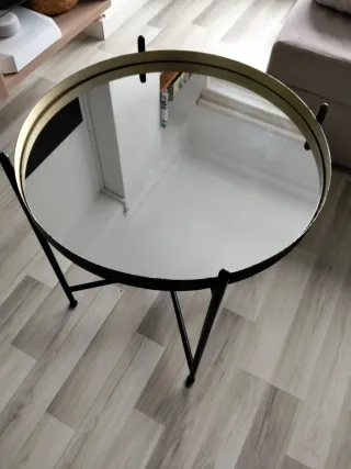 Elegante mesa de salón con un diseño moderno y sofisticado. - Tablero redondo de cristal. - Estructura metálica con detalles dorados. - Patas cruzadas para mayor estabilidad.