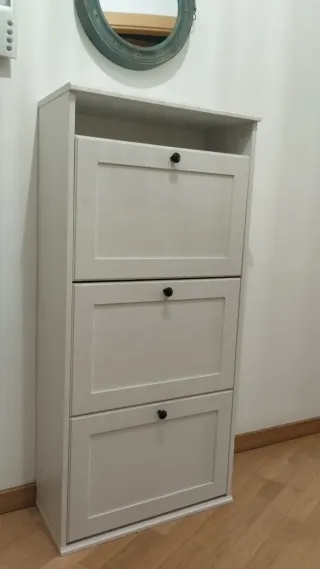 Mueble zapatero de diseño moderno con tres compartimentos abatibles con capacidad para 15 pares de zapatos aproximadamente. Está como nuevo. Medidas Ancho: 61 cm; Fondo: 30 cm; Altura: 130 cm - Acabado en color blanco. - Fabricado en madera.