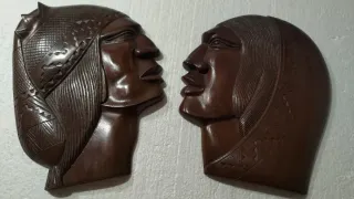 Conjunto de dos tallas de madera que representan a un hombre y una mujer indígenas sudamericanos. Son piezas decorativas únicas. -Para colgar en la pared. - Talla de hombre con tocado y detalles tribales. - Talla de mujer con cabello largo y detalles en el cuello. - Elaboradas en madera con acabado pulido. - Están tratados con cera. - Medidas: 24 cm x 19 cm aprox.