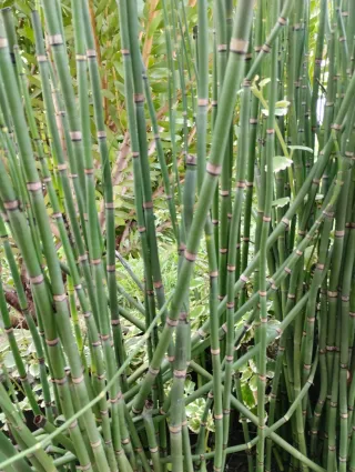 Planta de cola de caballo, también conocida como Equisetum. - Tallos verdes huecos y segmentados. - Anillos oscuros en los nudos.