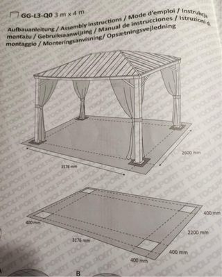 Marca Gardiun Alto total (cm) 283 Ancho total (cm) 297 Largo total (cm) 362 Peso (kg) 156 Material Madera Material de cubierta Acero galvanizado Color Gris Antracita, Madera Superficie (m²) 19.46 Certificados CE, FSC. Medidas entre pilares (cm) 224x290x200 Número de bultos 1 Peso bulto 1 (kg)Peso bulto 1 (kg) 186 Medidas bulto 1 (cm) 36x218x88