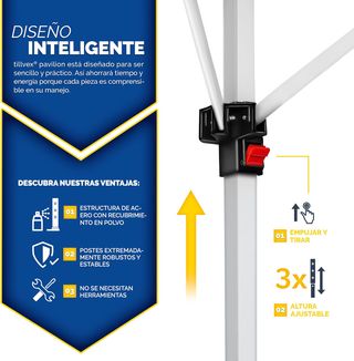Carpa de jardín Plegable Blanca con Ruedas 3 x 3 m Pop up Gazebo cenador Fiesta Exterior . Carpa plegable de color blanco 3 x 3 m, altura interior máx. 2,7 m (centro) Bloquea todas las patas con un solo toque (tecnología “One Push”) Patas ajustable en altura con bolsas de peso para buena estabilidad Patas con ruedas integradas para desplazar el pabellón plegado Lona de techo impermeable con recubrimiento de color plateado y protección UV 50+