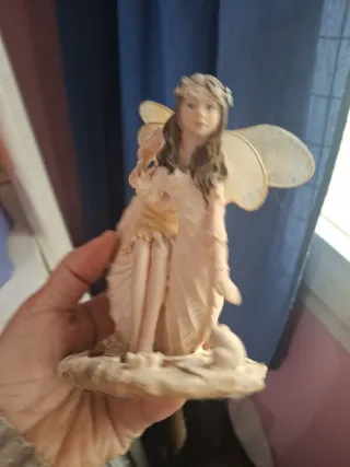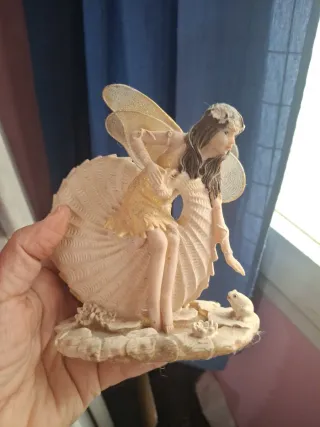 Encantadora figura decorativa de un hada, con un diseño delicado y detalles cuidados. - Base con forma de concha y elementos naturales. - El hada lleva un vestido y alas. - Incluye una pequeña figura de rana.