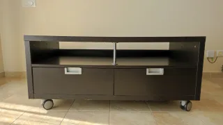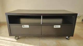 Mueble de TV en color wengué con dos cajones frontales y ruedas para facilitar su movilidad. Cuenta con un espacio abierto superior. - Acabado en wengué. - Dos cajones con tiradores plateados. - Ruedas para desplazamiento.