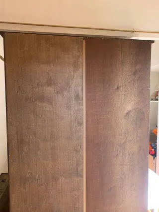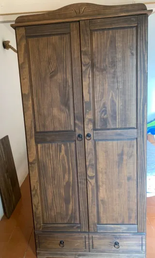 Conjunto de cuatro muebles fabricados en madera maciza. Son piezas robustas y duraderas. - Color marrón oscuro. - Diseño moderno y elegante. El mueble claro es el único que no es madera maciza. Urge vender de ahí el precio. Fácil de recoger aparcar y cargar.