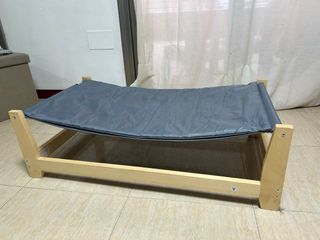 Cama elevada con estructura de madera y tela gris. -Marca: PawHut . - Estructura de madera. - Tela de color gris. - Tiene un “colchón “ estrecho que se separa. Casita a conjunto en mi perfil.