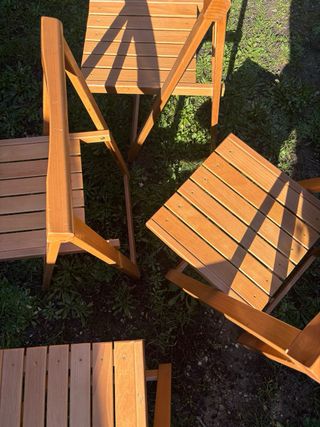 Conjunto de cuatro sillas de madera, perfectas para tu jardín o terraza. Son plegables, lo que facilita su almacenamiento y transporte. Tienen algún roce, las compré de segunda mano y estaban así