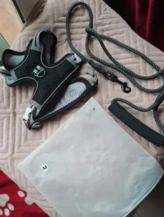 Conjunto de arnés y correa para gatos, ideal para razas como Bengali o Maine Coon. El arnés es ajustable y cómodo. - Arnés de color negro y gris. - Correa a juego con asa acolchada. - Incluye bolsa de embalaje con etiqueta de talla M.