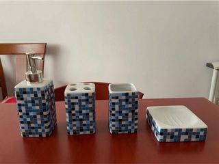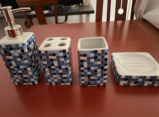 Conjunto de accesorios para el baño con un diseño de mosaico. - Dispensador de jabón. - Portacepillos de dientes. - Vaso. - Jabonera.