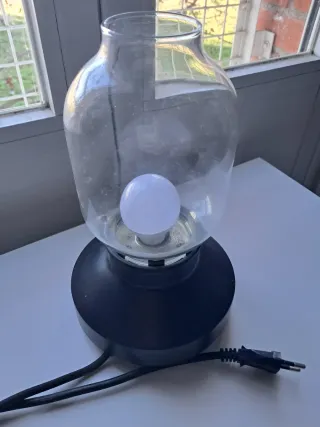 Lámpara de diseño moderno con base negra y tulipa de cristal. - Base de plástico resistente. - Tulipa de vidrio transparente.