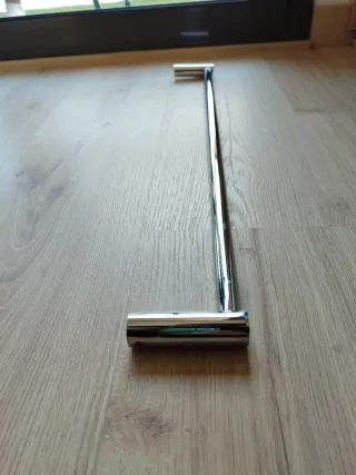 Barra toallero para instalar en la pared. Su diseño moderno y acabado brillante le darán un toque elegante a tu baño. - Fabricada en metal. - Color plateado. - En perfecto estado