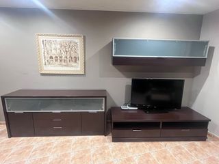 Conjunto de muebles de comedor con un diseño moderno y elegante. - Mueble bajo con espacio de almacenamiento. - Estante superior flotante. - Acabado en tonos marrones y transparentes. Urge vender por mudanza. Se vende junto o separado. Todo junto 200€. Separados, vitrina grande 100€, mueble tele 50€, vitrina superior 50€. Están en Vilanova i la Geltrú. Están montados