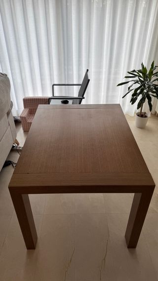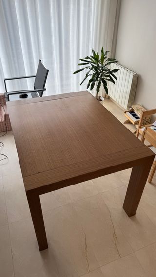 Mesa extensible con un diseño moderno y elegante. 120x90 y 177x90 extendida - Acabado en madera de alta calidad. - Color beige y marrón. - Tiene pequeños desperfectos del uso normal. - La parte extendida difiere ligeramente el color, se debe a que casi siempre ha estado cerrada El comprador debe hacerse cargo del transporte.