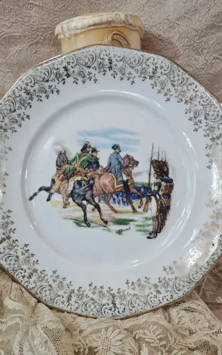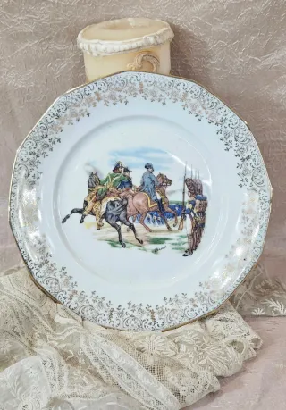 Precioso plato decorativo con un diseño de escena ecuestre, Napoleón, y borde floral. - Elaborado en porcelana. - Detalles en dorado. - Escena de jinetes y soldados.